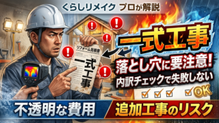 リフォームリフォーム見積書の「一式工事」は要注意!失敗しない業者の見抜き方と内訳チェックポイント 長年住み慣れた我が家のリフォームは、これからの生活をより豊かにするための大切な一歩です。しかし、リフォーム業界では不透明な見積もりによるトラブルが後を絶たず、「適正な価格なのか」「手抜き工事をされないか」と不安を感じているお客様も多いので...2026.04.10リフォーム
